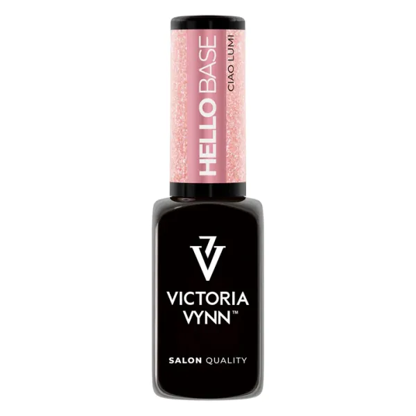 HELLO Base Ciao Lumi is een hybride basecoat in een warme champagne nude tint met glitter.